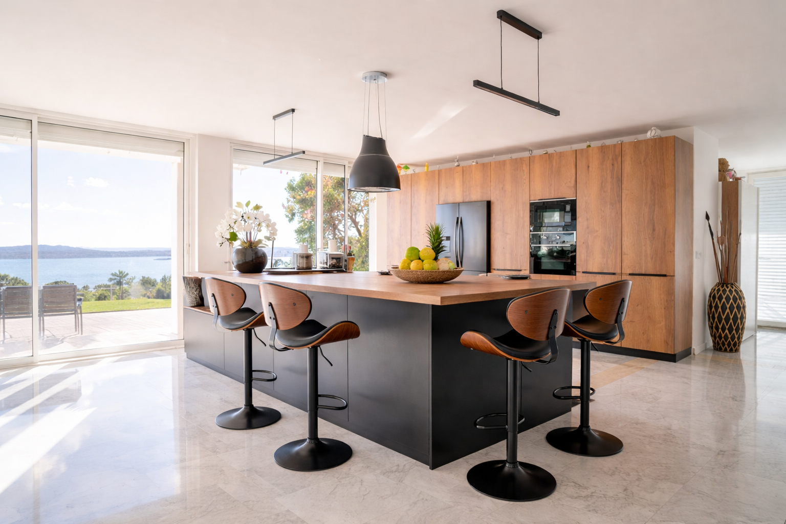 La pièce de vie, baignée de lumière, s’organise autour d’une cuisine haut de gamme ouverte sur la salle à manger et prolongée par une vaste terrasse plein Sud de plus de 100 m². À chaque instant, le regard se perd entre ciel et mer.